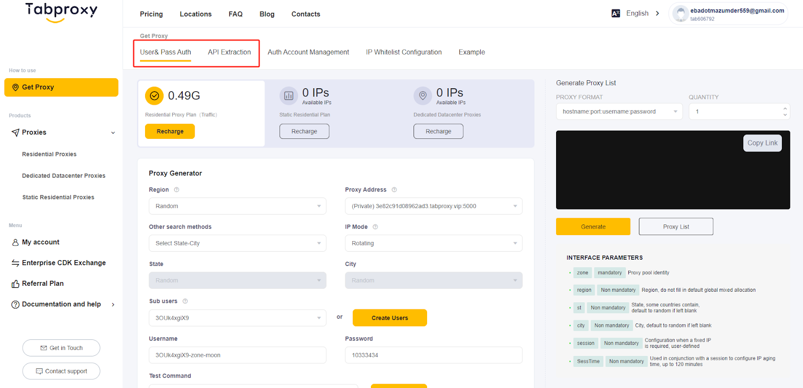 Click "Get Proxy" on the left side, and select "User & Pass Auth or API Extraction" extraction method.