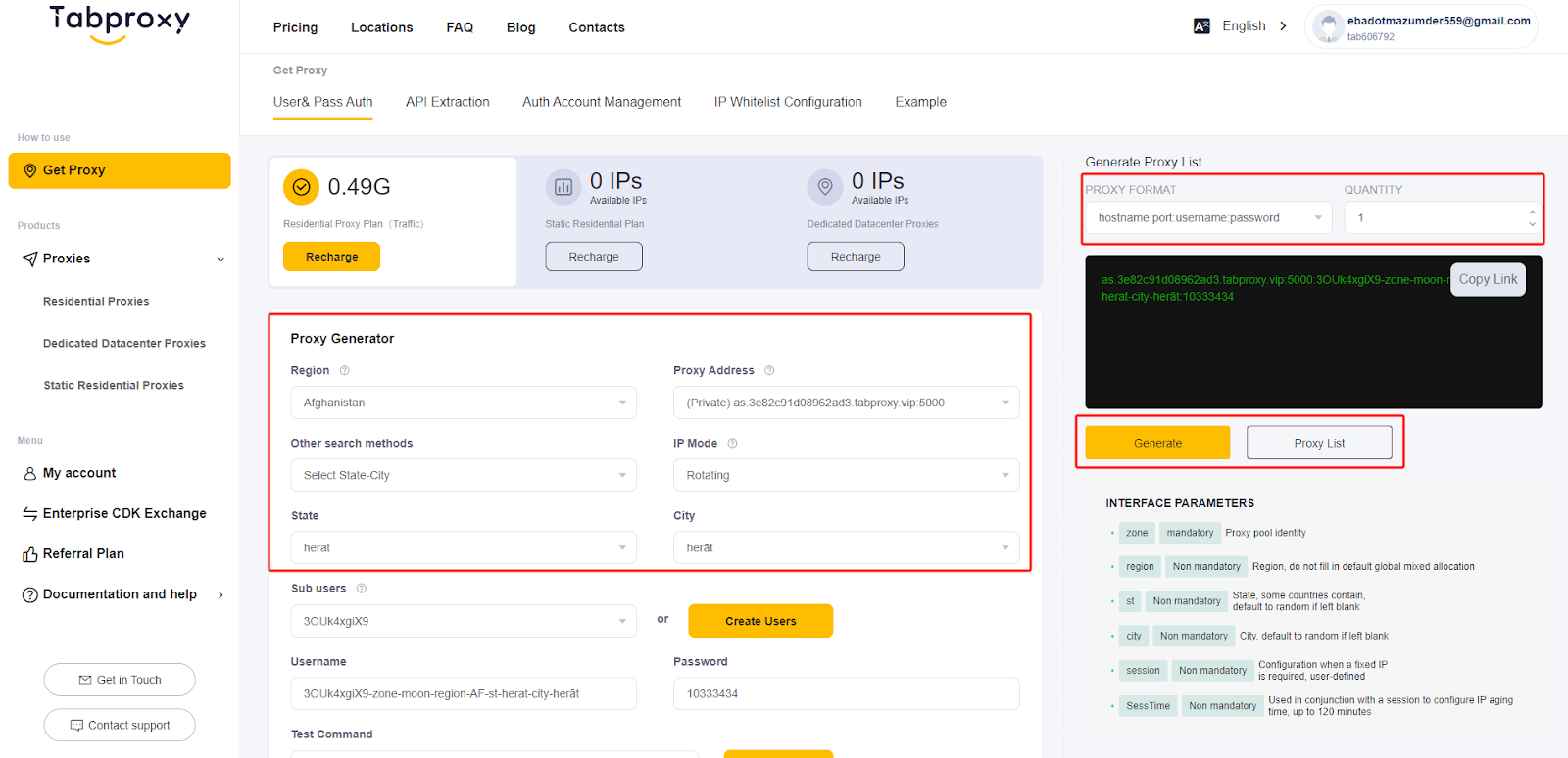 Select the "User & Pass Auth" extraction method, configure your needs in the agent generator, select " Proxy Format" and "Generation Quantity", and click Generate. Click "Proxy List," find the proxy you just generated, click "Export," and select "hostname:port:username: password. "Click "Confirm" to copy the IP information you just downloaded.