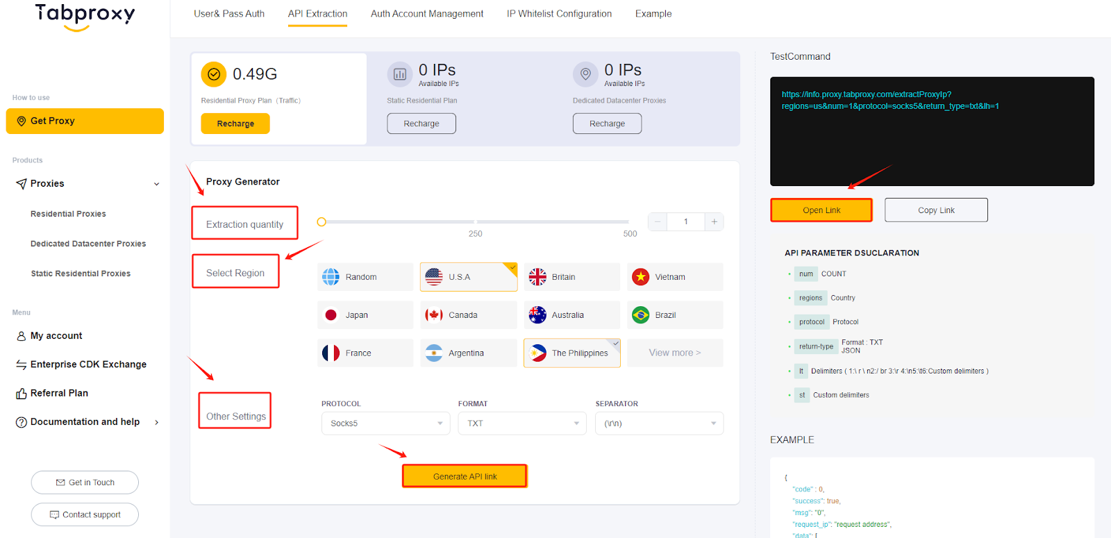 Choose the "API Extraction" extraction method, configure your extraction quantity in the proxy generator, select the IP region you want to extract, and choose your " PROTOCOL, FORMAT, SEPARATOR". Then, click "Generate API Link" and "Open Link" to copy the IP address.