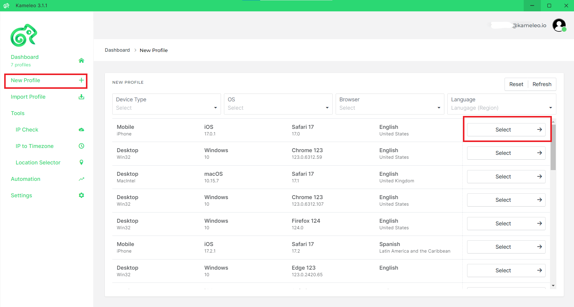 Open the Kameleo app, click on New Profile, then select one.