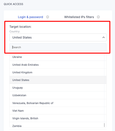 Select your Target location from the drop-down menu in the Quick Access section of your SOAX dashboard.