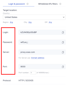 Copy the Server, Login, Password, and Port credentials from your SOAX dashboard.