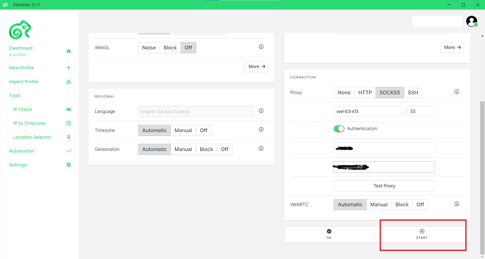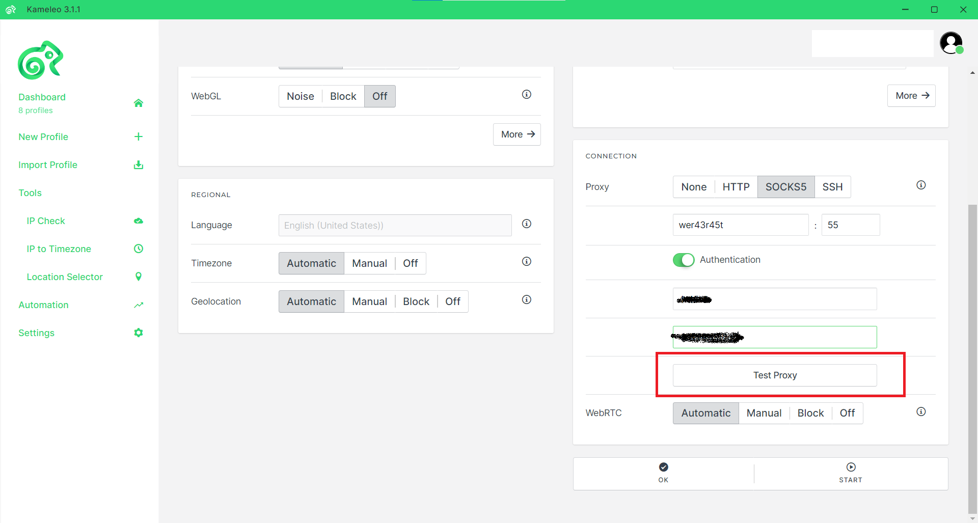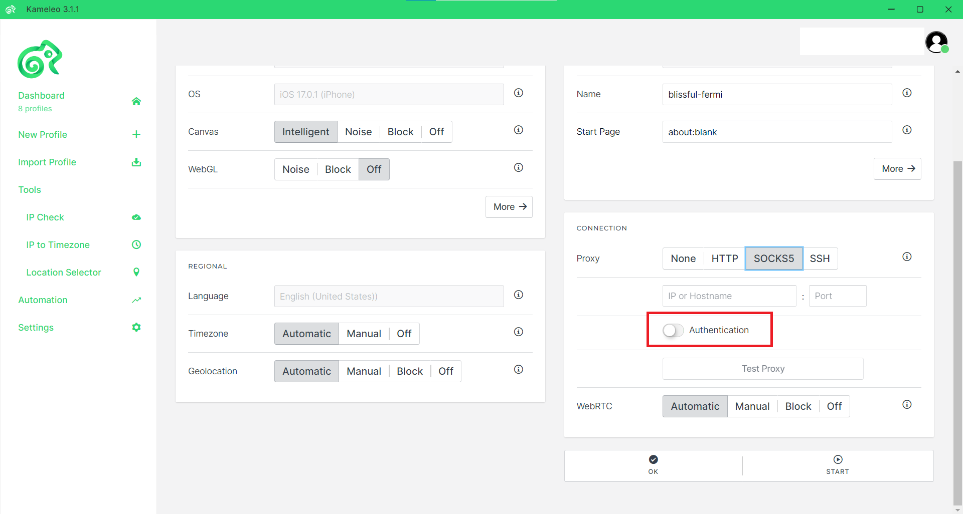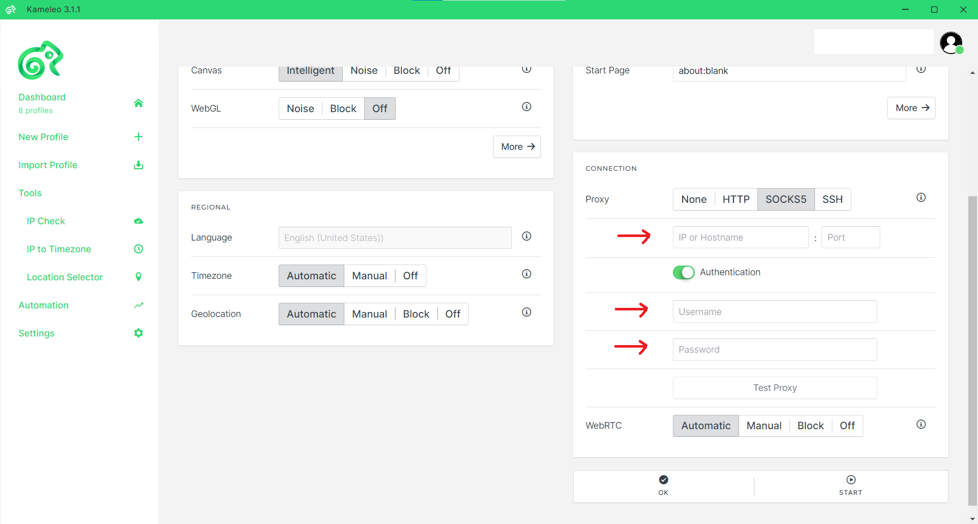 Enter the Server and Port information into the corresponding Settings fields in Kameleo and switch on the Authentication toggle.