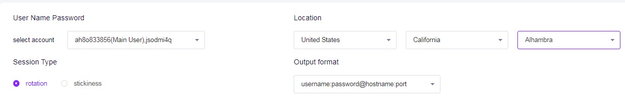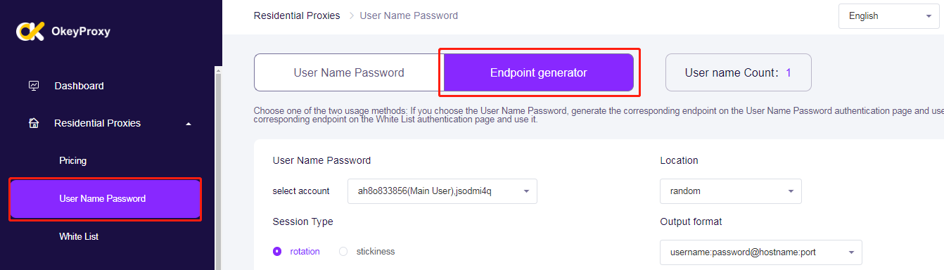 Go to the "Residential Proxies" - "User Name Password" - "Endpoint Generator" to get your proxy information.