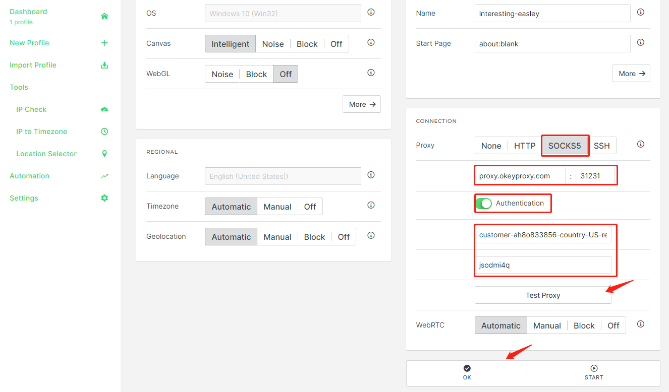 Open the profile for your needs. Copy proxy info to Kameleo and test it. Then click "OK" to apply the proxy.