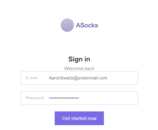 Open the ASocks web page and enter your account using the sign-in form. If you do not have an account on ASocks, create one and use it to enter the service. Press the Get started button