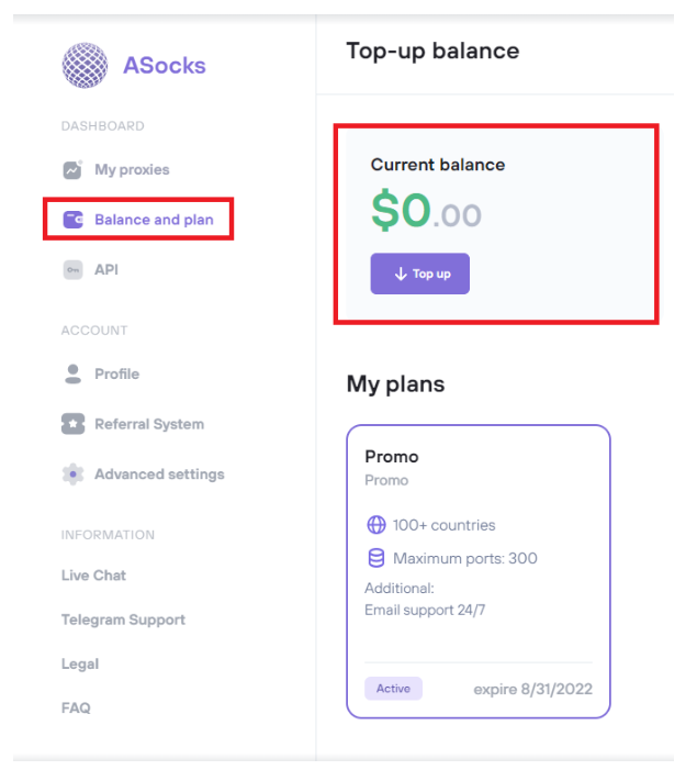 If required, refill the balance by clicking the Balance and plan tab on the left-side menu, press the Top up button and follow the instructions.