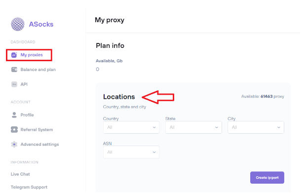 Go to the My proxies tab on the left-side menu and click it. The corresponding window should open. Choose the preferred country, and optionally you may select the state and city from the drop-down lists. ASN is an optional parameter as well, and is used by the advanced users for receiving a proxy from the preferred autonomous system.