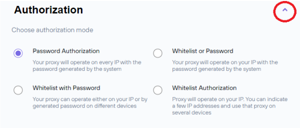 Choose the Authorization method by clicking the arrow sign and expanding all available options.Password authorization (default option): this option allows a user’s authorization on any IP-address by using the generated password.