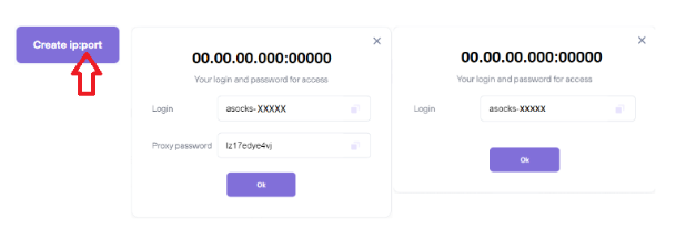 Once all the required parameters have been set up, click the Create ip:port button, and the dialog window containing the IP-address and login should open. The proxy password is not available only for the Whitelist Authorization option.