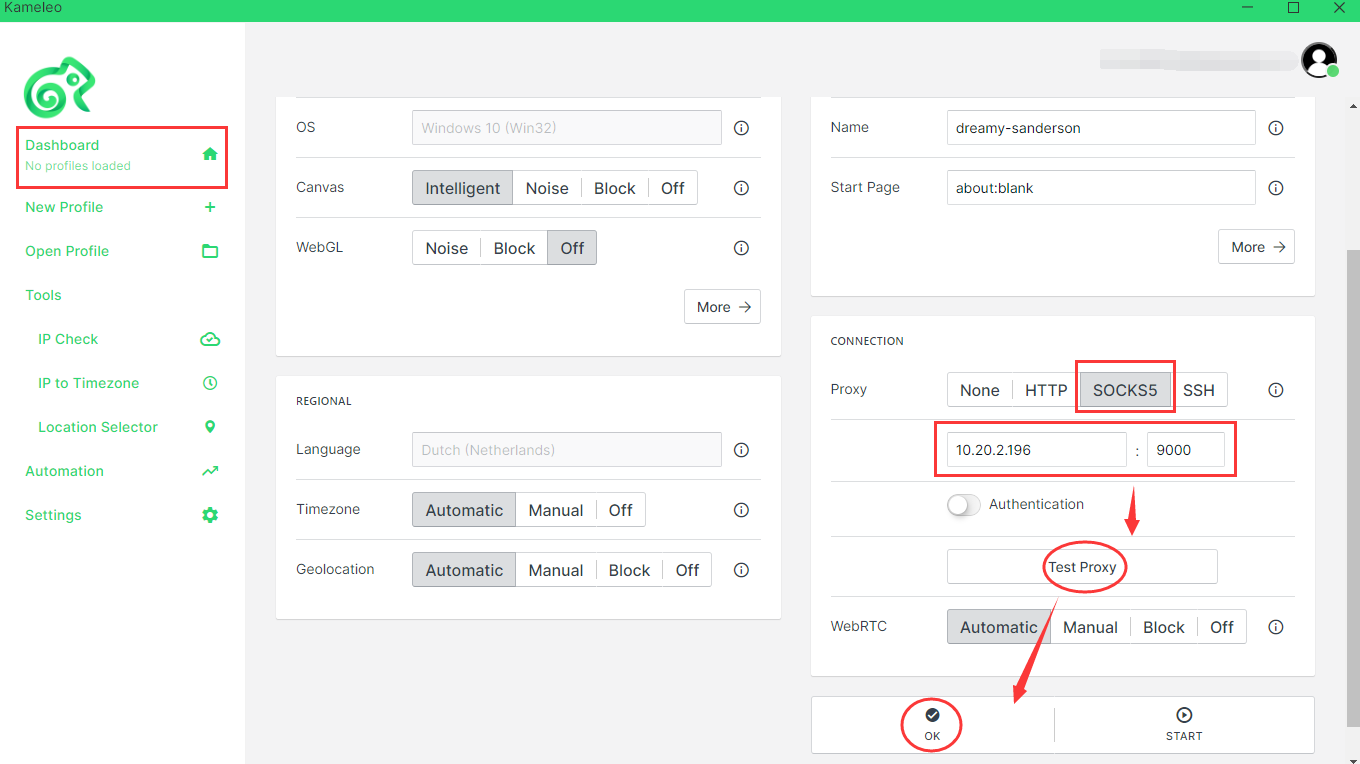 Proxy type select SOCKS5, Local IP and port in the previous step click "Copy" to copy and paste here. You can test the credentials with the Test Proxy button.