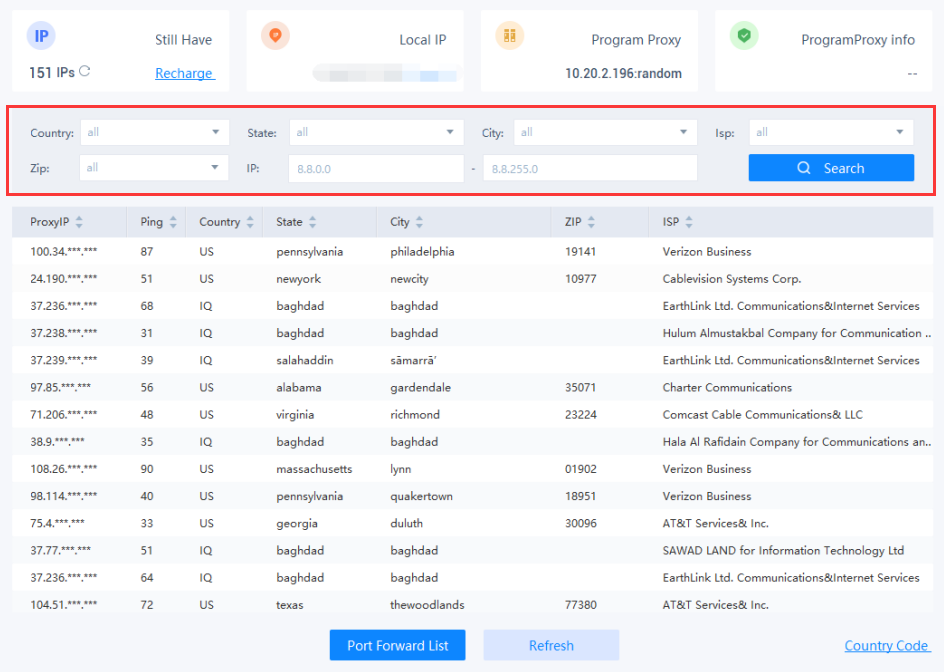 Filter the country/state/city, click "Search" to get the IP list of the target area; or directly search the zip code/target IP segment of the target city for quick positioning.
