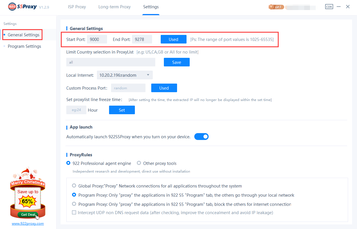 Click General Settings, where you can configure the required port number and country search range. The maximum number of ports that can be set each time is 500.
