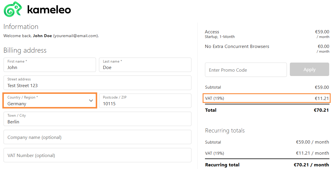 Below is an example using the purchase of the Startup Plan, which costs €59. Since Germany was selected as the Country/Region that is in the European Union, a 19% VAT was applied, adding €11.21 in additional charges.