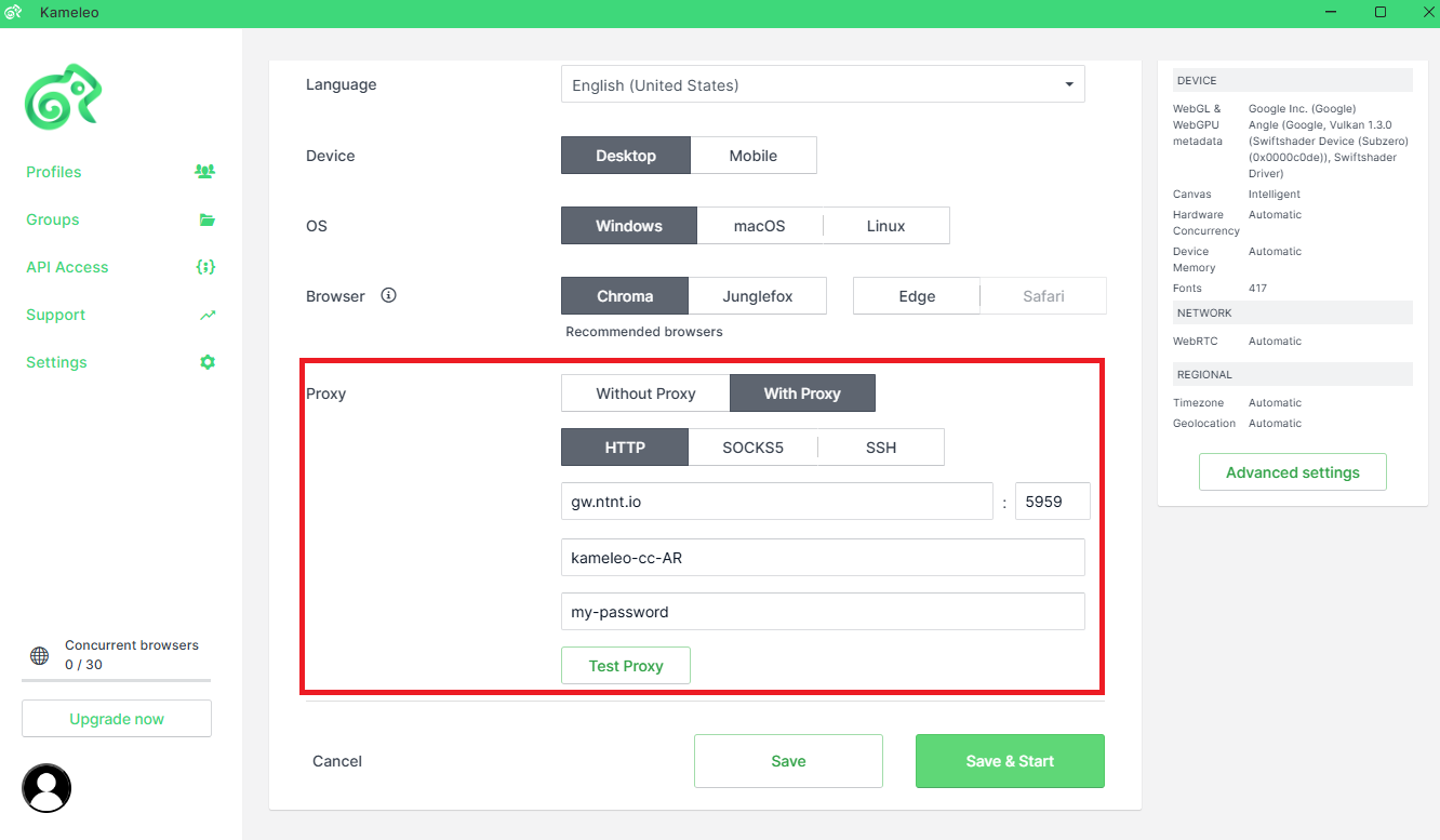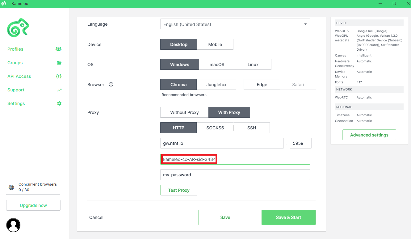 - proxy user: username-cc-country_code [kameleo-cc-AR]