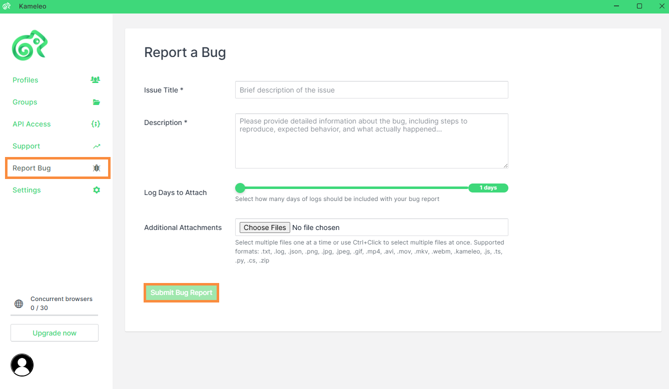 Kameleo includes a built-in bug reporting feature accessible directly from the application interface. To access it simply open Kameleo, you will see the "Report Bug" button on the menu, by left side.