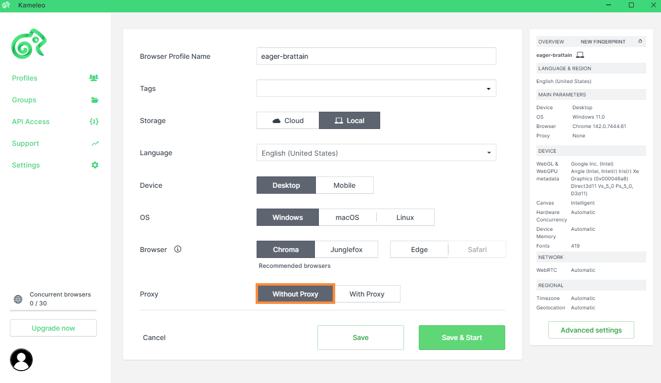 By default, Kameleo connects without a proxy and uses your device’s IP Address.