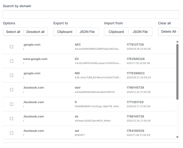 - Use the "Search by domain" field at the top to filter cookies for specific domains.
