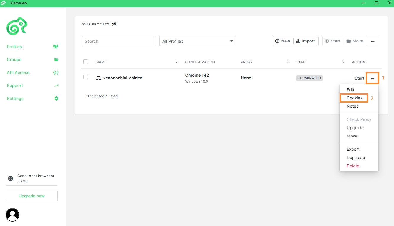 Click the three dots next to the "Start" button and select the "Cookies" tab.