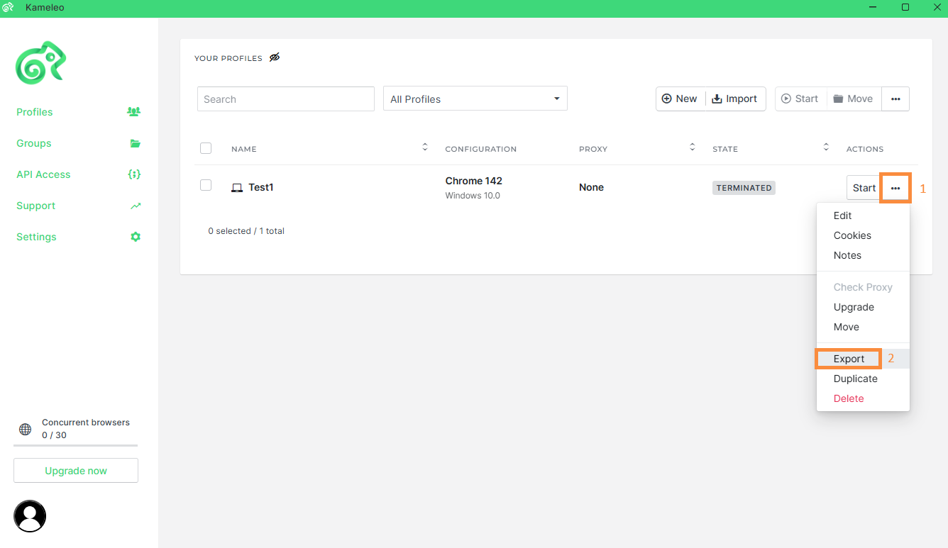 Kameleo profiles contain all browser fingerprint configurations and related browsing data such as cookies, passwords, browsing history, extensions, bookmarks, and more. If you are not using Cloud Profiles, you can export profiles to .kameleo files and share them with team members, allowing them to continue work exactly where you left off.