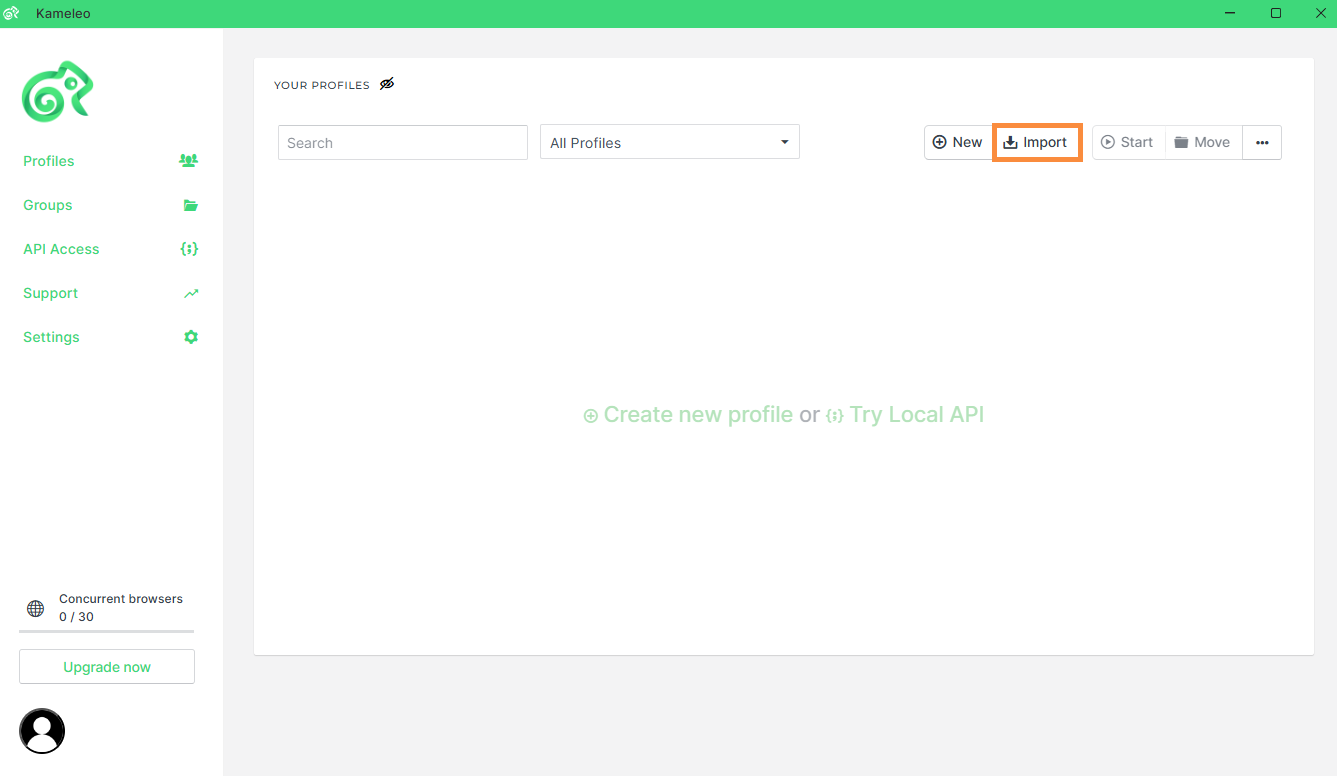 Instead of using the import function, you can also drag and drop .kameleo files directly onto the Kameleo dashboard to import them. You can import multiple profiles at once using either method.