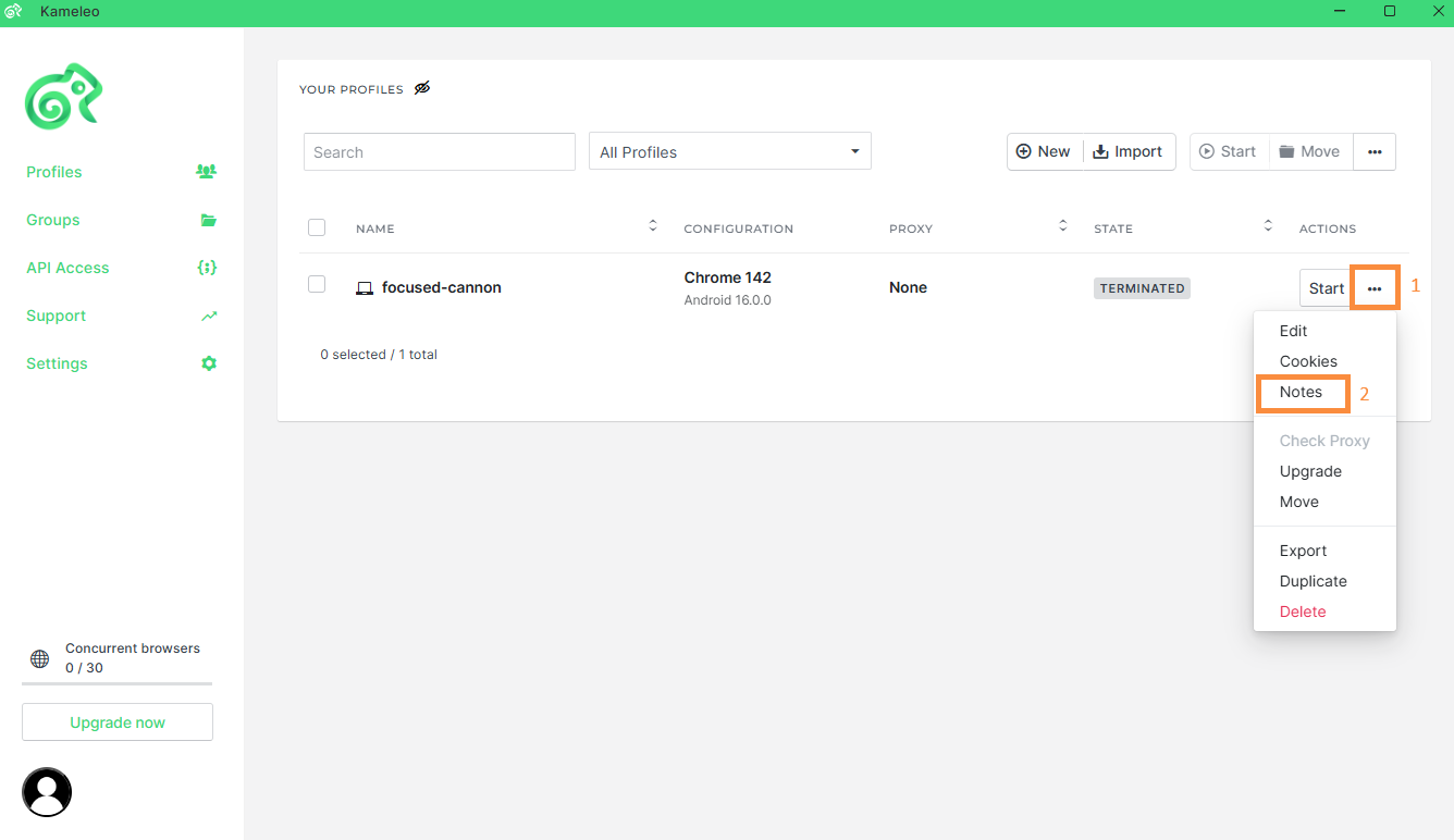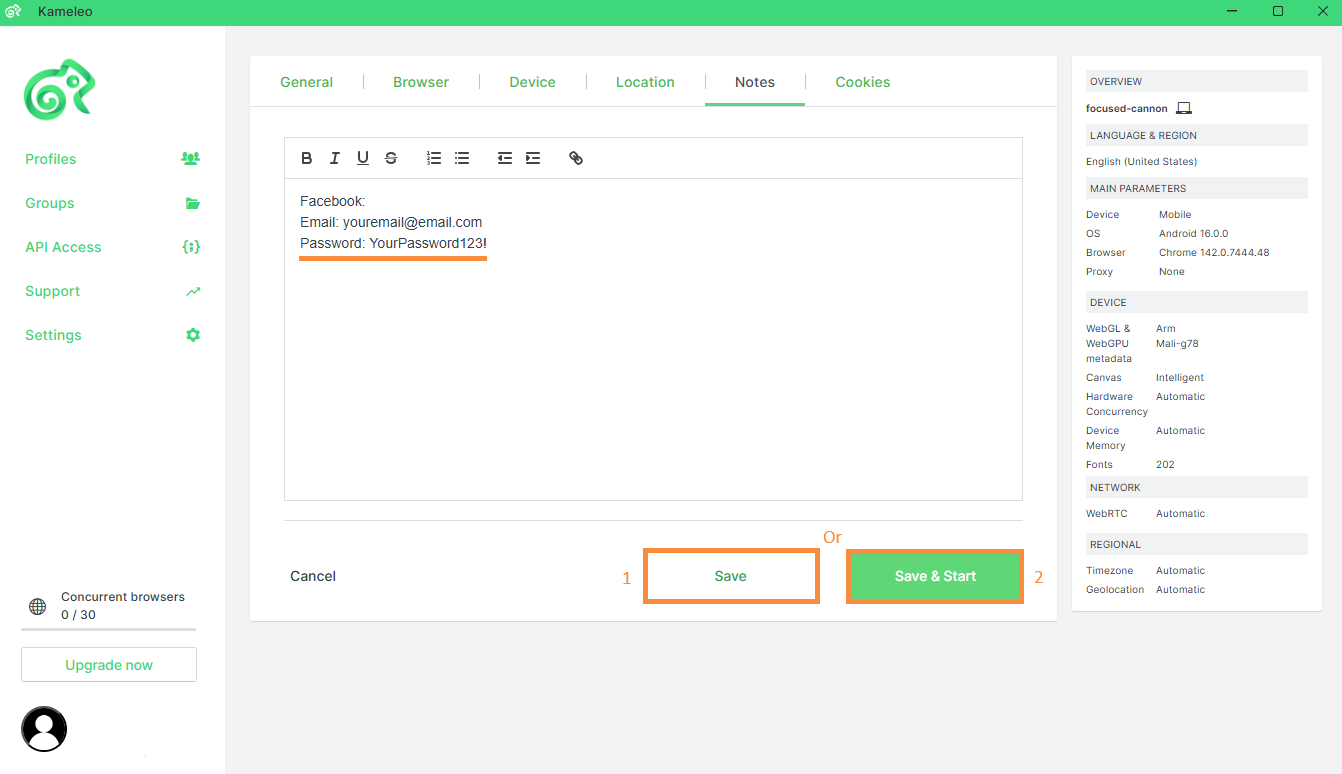 Kameleo allows you to attach notes directly to each of your Browser Profiles. This helps you and your teammates remember key details such as passwords, IP addresses, account status updates, or simple task reminders, or anything you need to keep your workflow consistent.