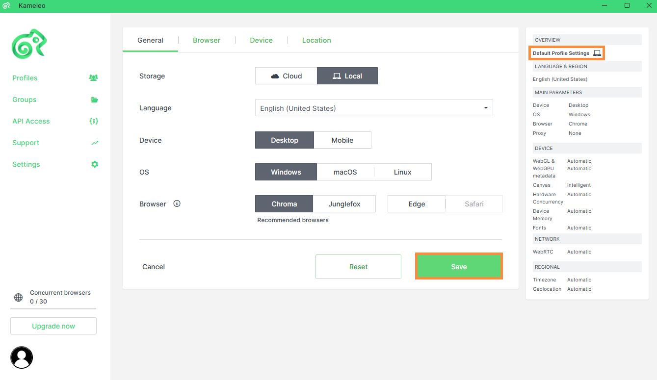 Global Application Settings allow you to work more efficiently with Kameleo. You can access these settings by clicking "Settings" in the left-hand menu.