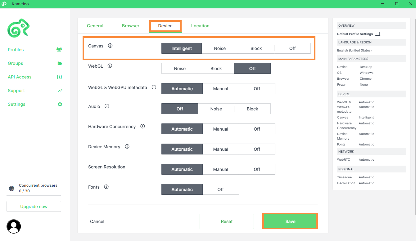 You can set a default canvas spoofing option for all new profiles in Kameleo Settings, to achieve this by: