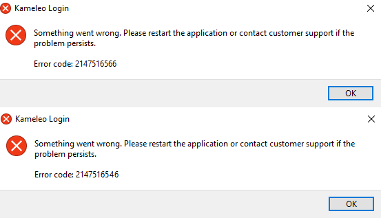 If you encounter error messages containing "2147516566" or "2147516546" when starting Kameleo, this article will help you resolve them. In general, they can be recognized because they appear like this: