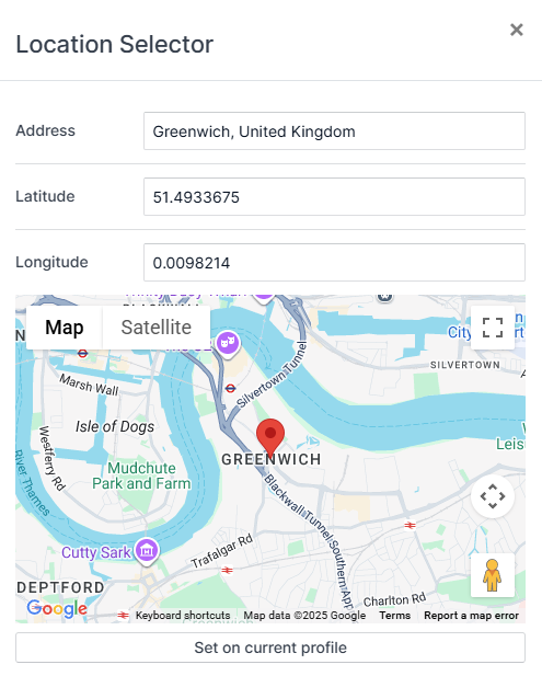Alternatively you can use the "Location Selector" and choose your location from the map which will automatically fill the Latitude and Longitude based on the selected location after clicking "Set on current profile".
