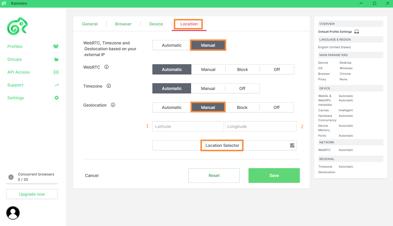 Kameleo allows you to control how Geolocation behaves in your Browser Profiles to prevent detection with geolocation fingerprinting. To change the setting simply: