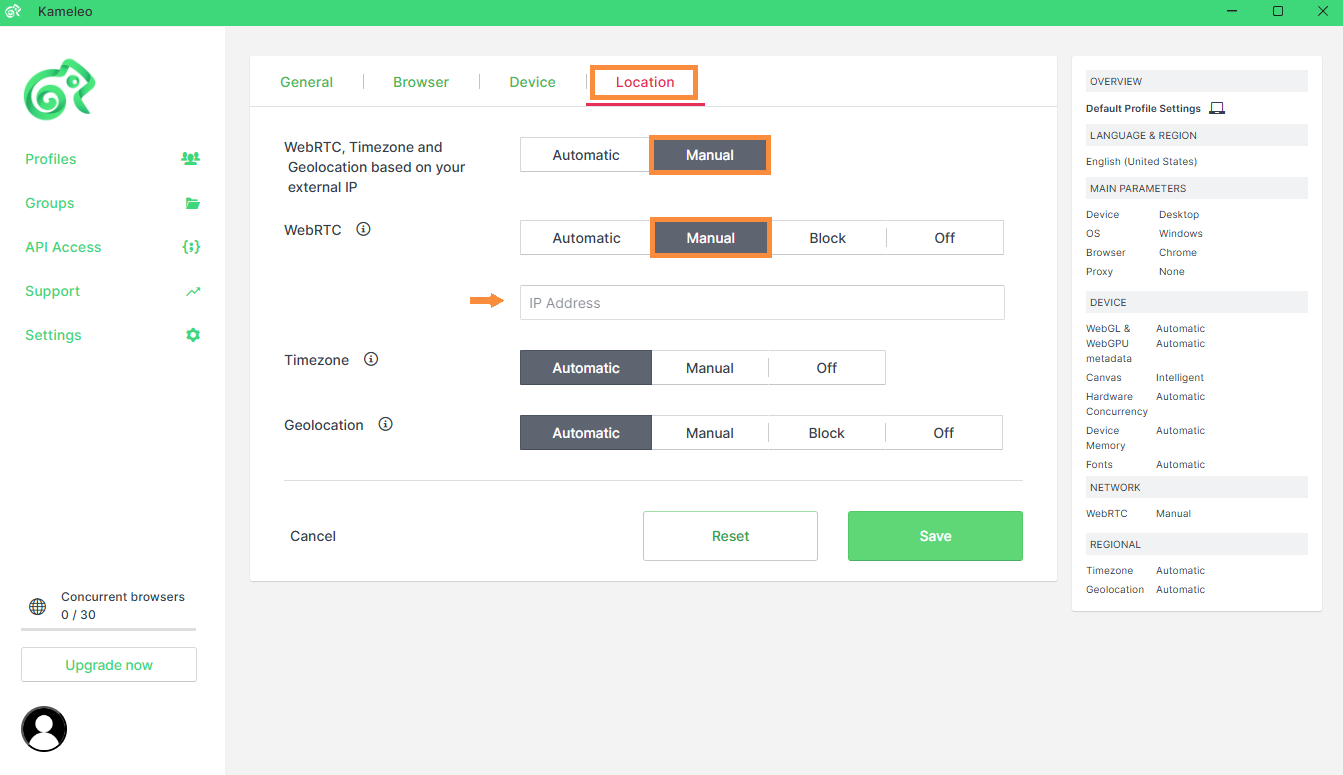- Automatic (Recommended): Kameleo automatically sets WebRTC IP values based on your proxy. This ensures consistency and prevents IP leaks.