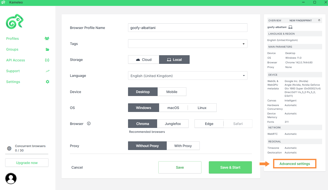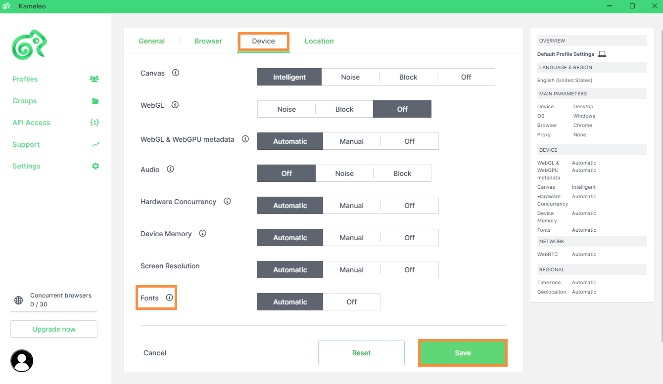 Kameleo allows you to control whether websites can see the real list of fonts installed on your device. Installed Fonts are part of the browser fingerprint, so keeping this value consistent across profiles is important.