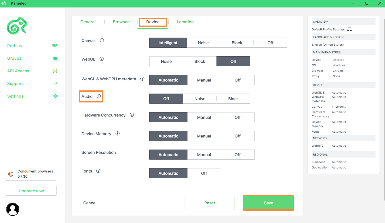 Kameleo allows you to control how your browser profile reports its Web Audio API fingerprint. Audio fingerprinting is another technique websites use to identify devices, so keeping this value consistent across profiles is important. To modify this, simply: