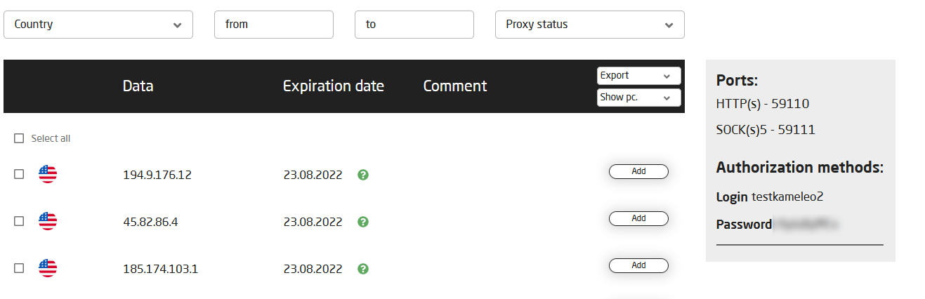 You can already see the details of your purchased proxies. You can see on this board everything you need: IP, port (select HTTP(S) or Socks5) and the authorization fields.