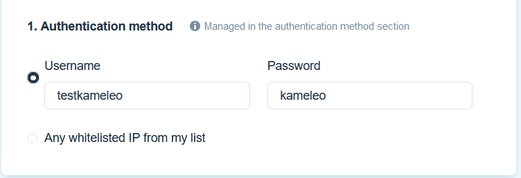 Please add the same values to the Authentication method that you have given in the previous step if you will use the Username/password. Choose whitelisted IP, if you have previously added your IP to the whitelist.