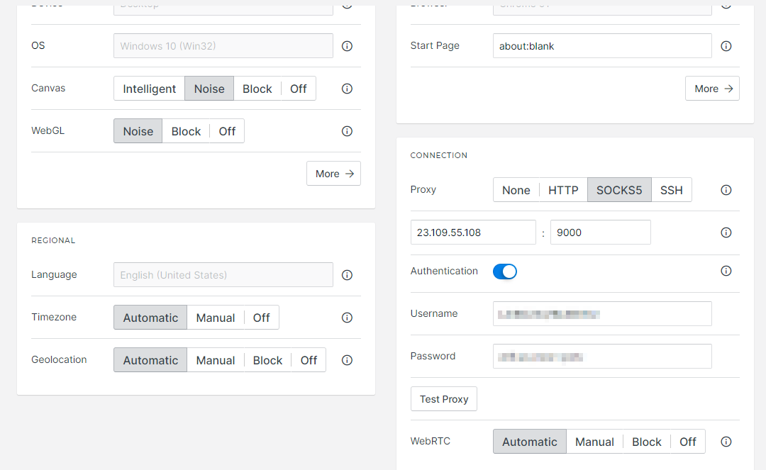 Put the proxy details in the matching fields. Make sure to click the Authentication button and write your username and password (Depending on your targeting settings.) Leave both the Time zone and Geolocation Settings on Automatic Mode so they get adjusted automatically based on your Proxy IP.