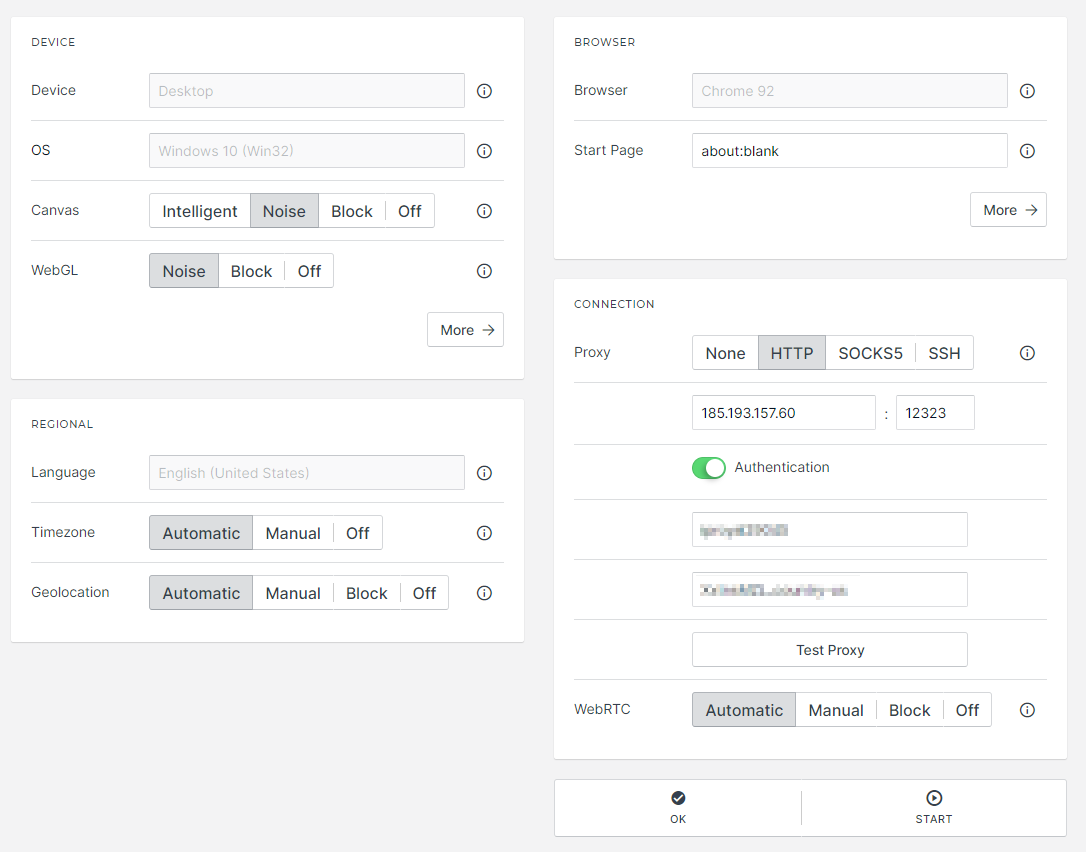 Just copy and paste the required data to Kameleo. By clicking on Test Proxy, you can check that everything is correct. Leave everything on Automatic, then Start the profile.