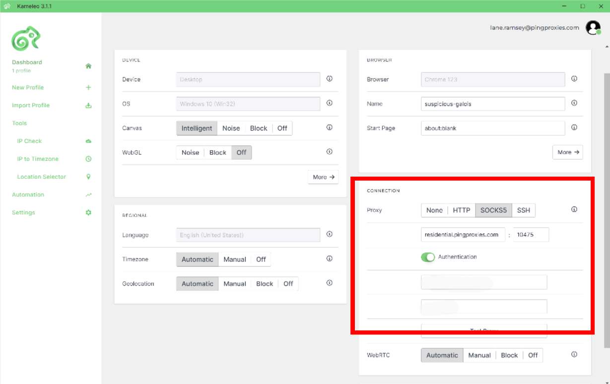 By integrating Ping Proxies into your Kameleo setup, you can change your browser sessions digital fingerprint and IP addresses, allowing you to maintain multiple profiles across a wide range of websites, all from a single piece of software.