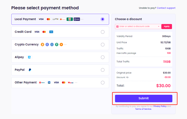 Select the right package and payment method and click “Submit.”