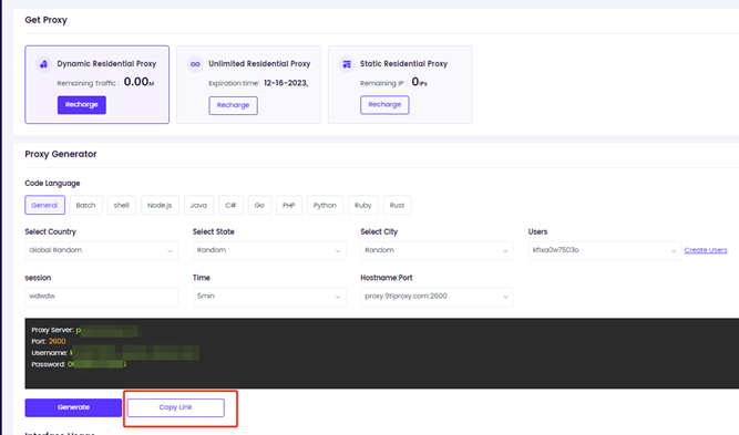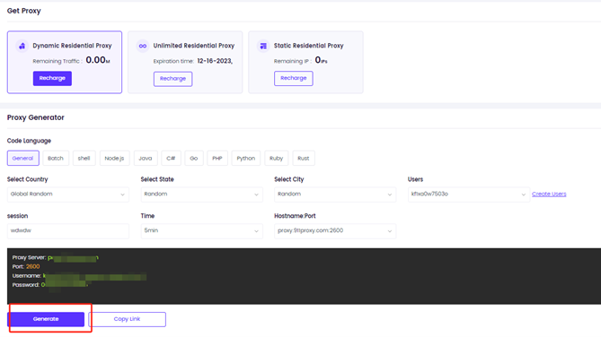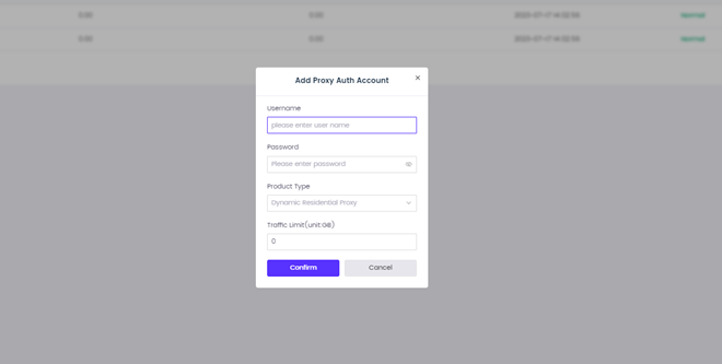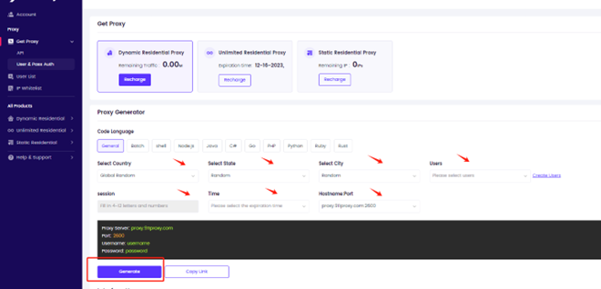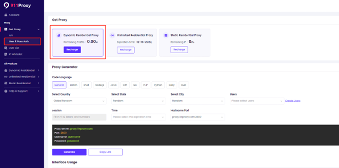 Click "User & Pass Auth" to select a dynamic residential proxy.